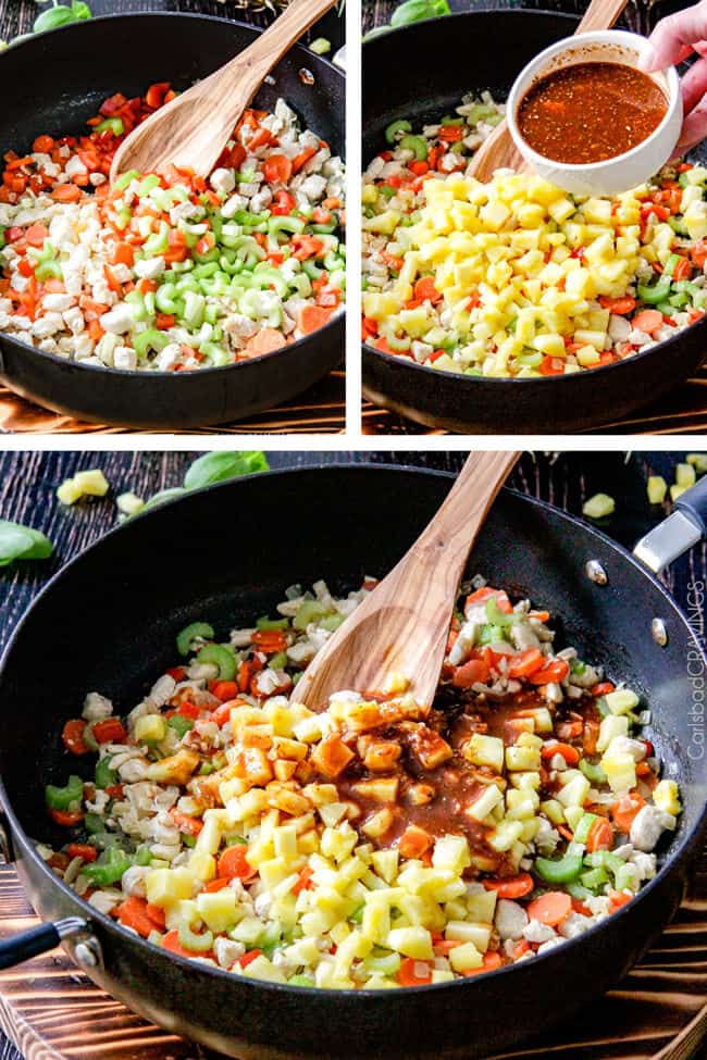 This Pineapple Chicken Stir Fry is completely customizable as far as the veggies go. I chose bell peppers, carrots and celery but it would also be delicious with broccoli, water chestnuts, snap peas, asparagus or zucchini – simply stir fry whatever veggies you have in your fridge!