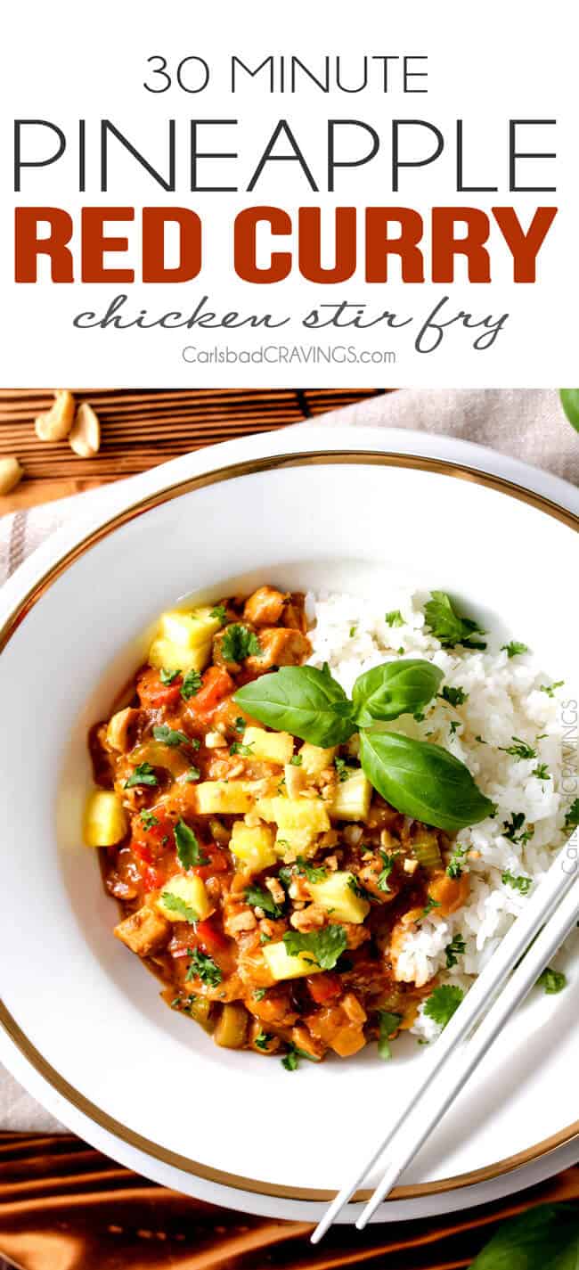 This Pineapple Chicken Stir Fry recipe might look familiar because I modified it from my Thai Chicken Lettuce Wraps because I am so obsessed with that sweet and savory sauce and now this sauce. And of course I’m obsessed with fresh pineapple. And peanuts. And peanut butter. So now I am obsessed with this Thai inspired Pineapple Chicken Stir Fry! And you will be obsessed with one forkful and giddy once you see how quick and easy it is!