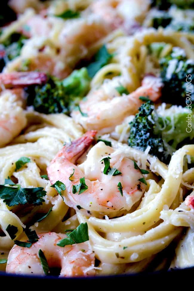 OMG! I’m obsessed with broccoli in my fettuccine, but I need to try shrimp! Like a Alfredo shrimp scampi… DYING!!