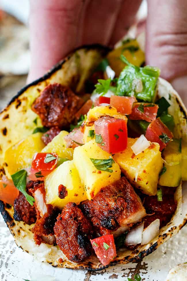 Authentic Tacos Al Pastor exploding with restaurant flavor made with thinly sliced chile pineapple marinated pork, grilled to perfection and served with caramelized pineapple.