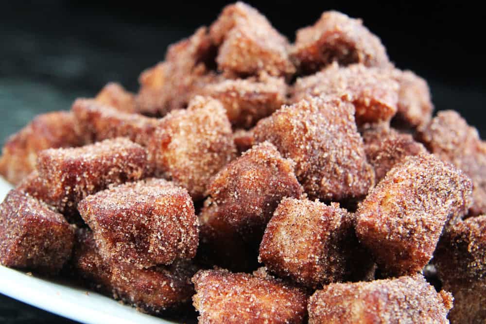 - In a large, nonstick skillet, add enough oil to cover ¼ inch up the bottom of the pan. Heat over medium heat; when oil is hot, add half of the cubes and pan fry until one side is golden brown, flip and pan fry the other side until golden brown, approximately, 1-2 minutes per side, watching closely so they don’t burn.When browned, immediately add cubes to the cinnamon/sugar bowl and toss using a spatula (because they are hot!), pressing sugar/cinnamon into the cubes until well coated. Repeat for remaining angel food cake bites.
