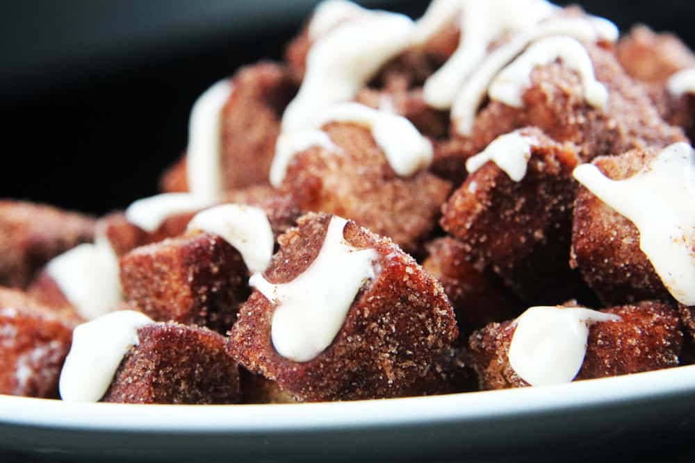 - For the cream cheese frosting, beat the cream cheese until creamy then beat in powdered sugar, vanilla and 3 T milk. Slowly add additional milk for a thinner consistency if desired. Drizzle all frosting all over bites or use as a dip.