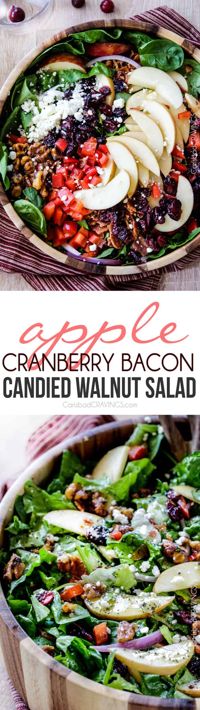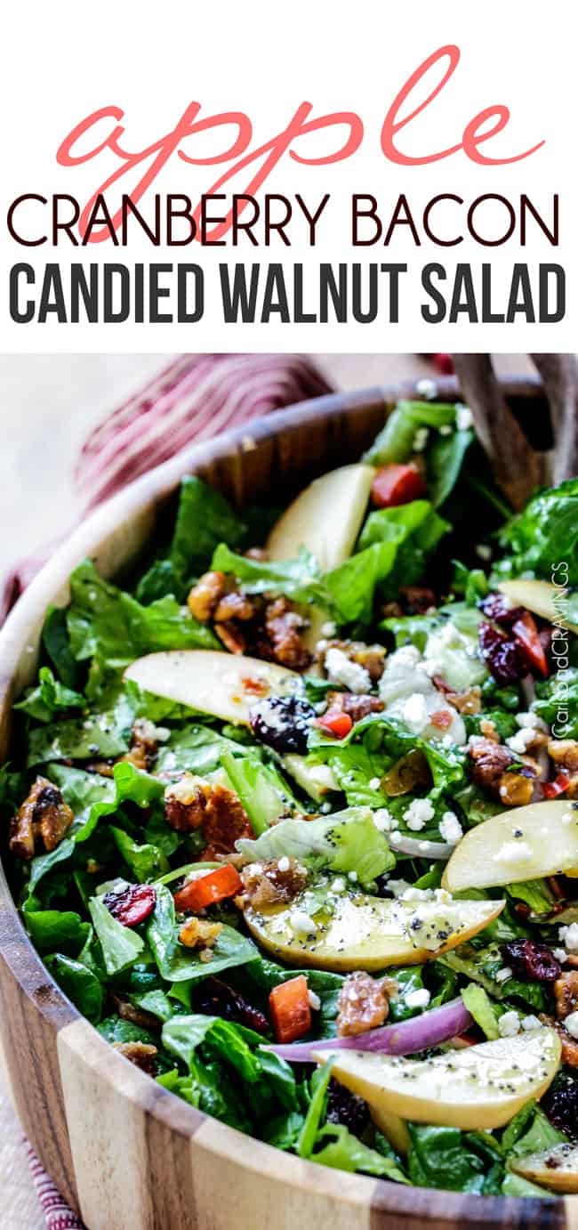 This Apple Salad is bursting with apples, cranberries, candied walnuts, bacon, and feta all drizzled with sweet and tangy Apple Poppy Seed Vinaigrette. It’s a refreshing balance of sweet and savory and gorgeous for special occasions but easy enough for everyday – and you are going to want to this Apple Walnut Salad every day. It’s the perfect addition to your Thanksgiving feast because not only is it scrumptious and deceptively sophisticated, but it can all be prepared beforehand for a NO STRESS side that everyone will rave about! (Updated recipe post with video!)