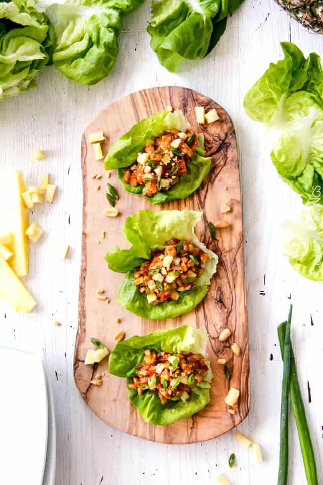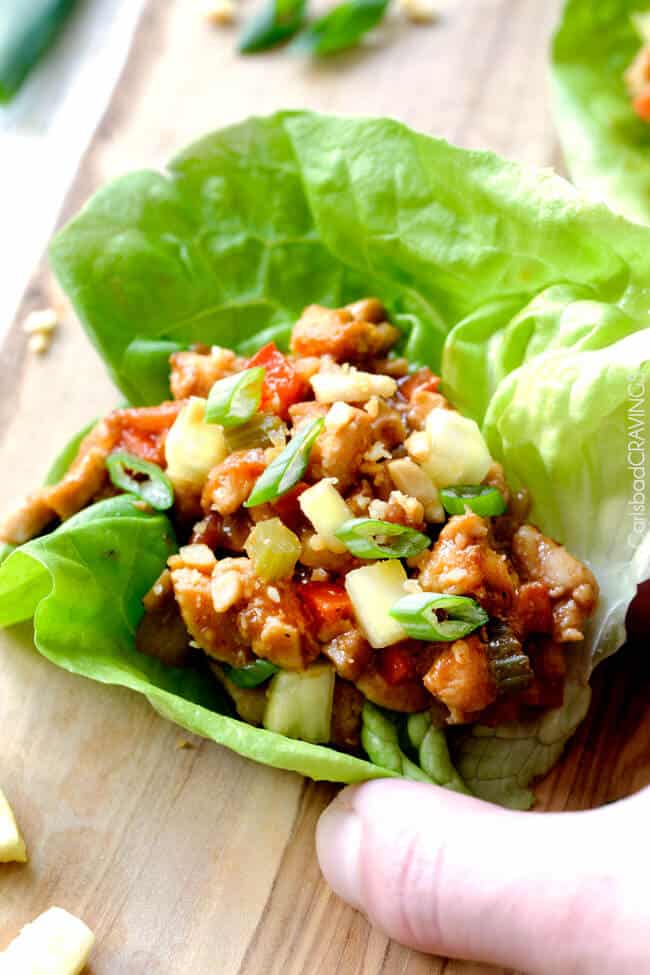 - Fill lettuce leaves with desired amount of filling then garnish with fresh pineapple, green onions and peanuts.