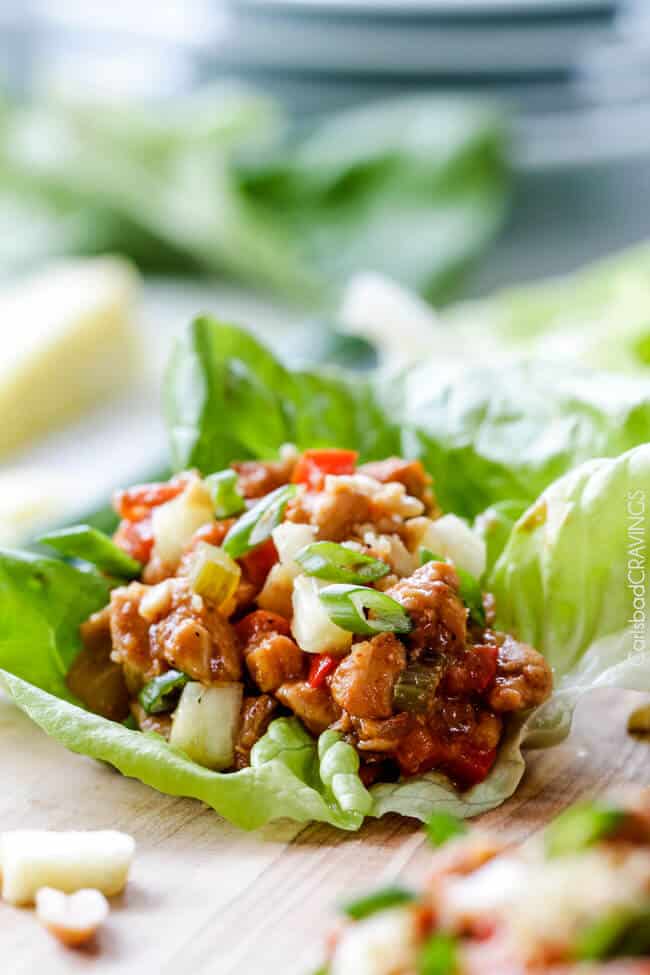 Butter lettuce, also called Boston and Bibb lettuce, is the best lettuce for lettuce wraps. It tastes richer and less watery than other lettuces, and boasts sturdy, broad leaves and can hold a healthy amount of filling without tearing. If you can’t find butter lettuce Romaine hearts are the next best option. They are crisp and easy to pull apart into individual leaves. Their main drawback is they are narrow so, take care not to overfill.