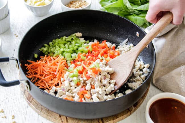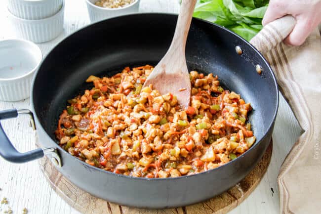 You can customize the veggies with what you have on hand, omit what you don’t like, add more of what you do. You can use diced mushrooms, water chestnuts, zucchini, bok choy, bean sprouts, etc, just make sure you have CRUNCH!