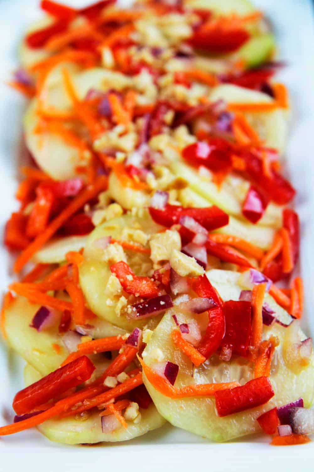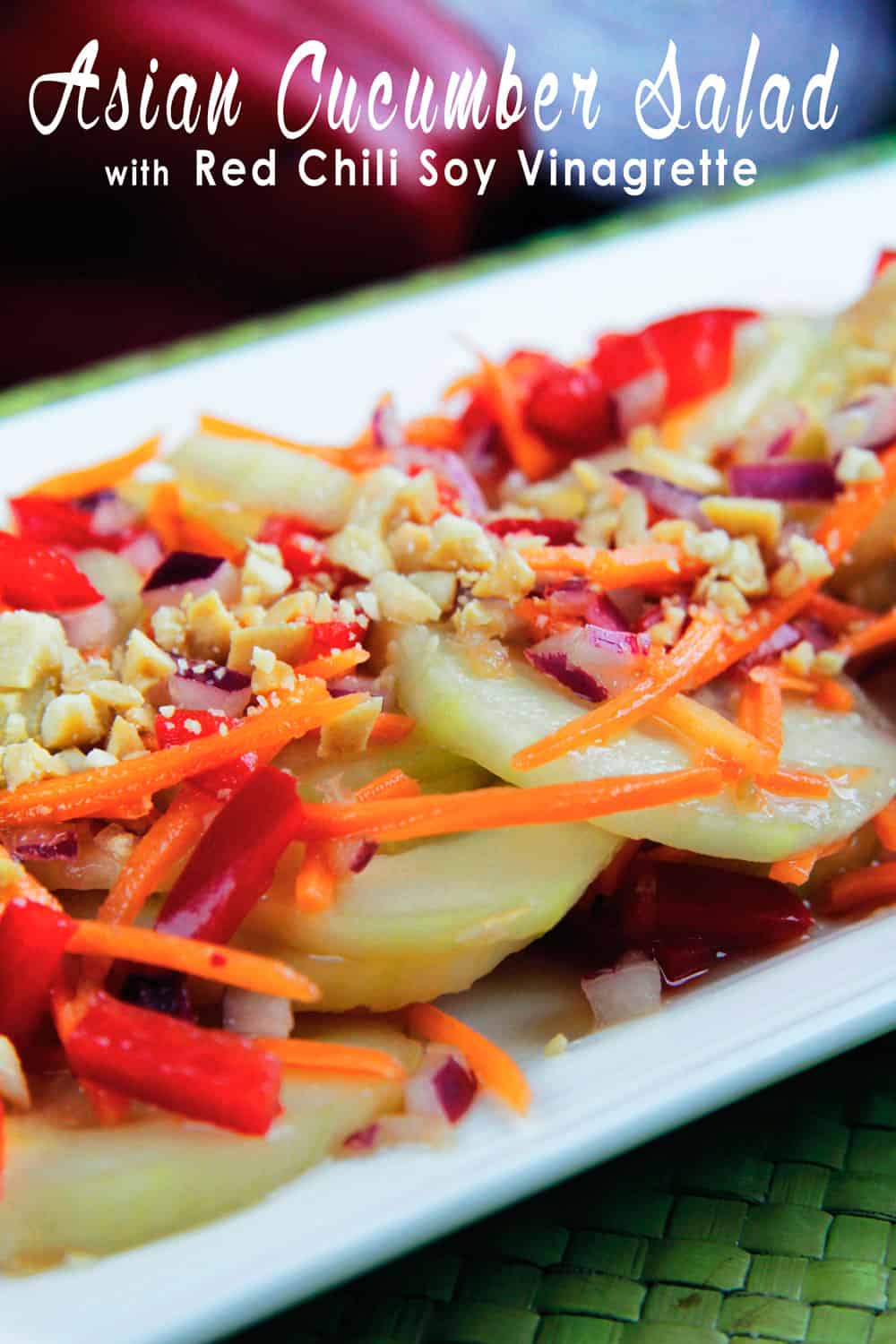 This Thai Cucumber Salad recipe is not only bursting with chilled cucumbers but carrots, bell peppers and red onion for a popping fresh crunch, but the real star is the Red Chili Soy Vinaigrette. It infuses the Asian Cucumber Salad Recipe with a sweet and savory zing that is simply irresistible!Â