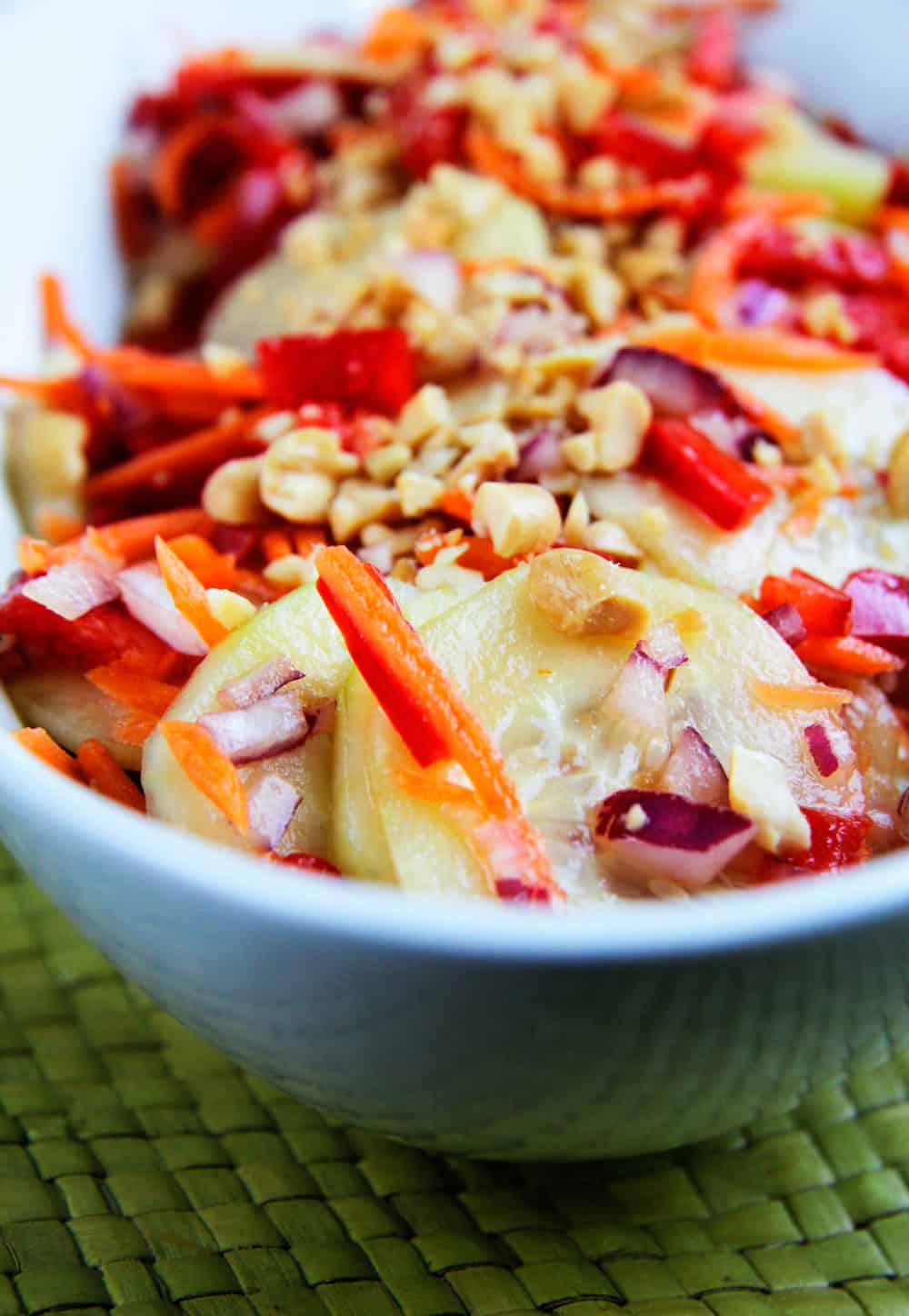 - Whisk Dressing ingredients together in a large bowl. Add salad ingredients and toss to coat. Chill 1 hour before serving. When ready to serve, toss well. Garnish with chopped peanuts.