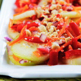 This Thai Cucumber Salad Recipe!  Unlike a lot of salads, this salad is marinaded in a vinaigrette so the dressing/salad is almost zero fat!  A vinaigrette of  Thai Red Chili Sauce, soy sauce, rice vinegar, sesame oil, lime juice, ginger, garlic and a dash of sugar.  Can you taste it now?!