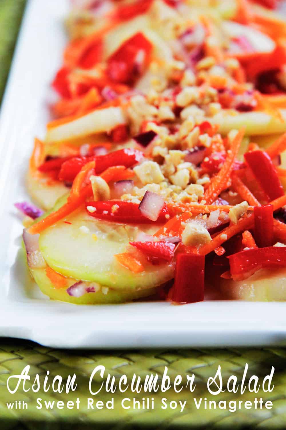 As the cucumber, carrots, bell peppers and red onion slumber in the marinade, they soak up the Asian flavors for a subtly sublime taste and a a not so subtle crunch of thinly sliced cucumbers, matchstick carrots, red bell peppers and peanuts. Â This Asian Cucumber Salad Recipe is cold, crisp, refreshing, with a slight zing from the chili sauce.