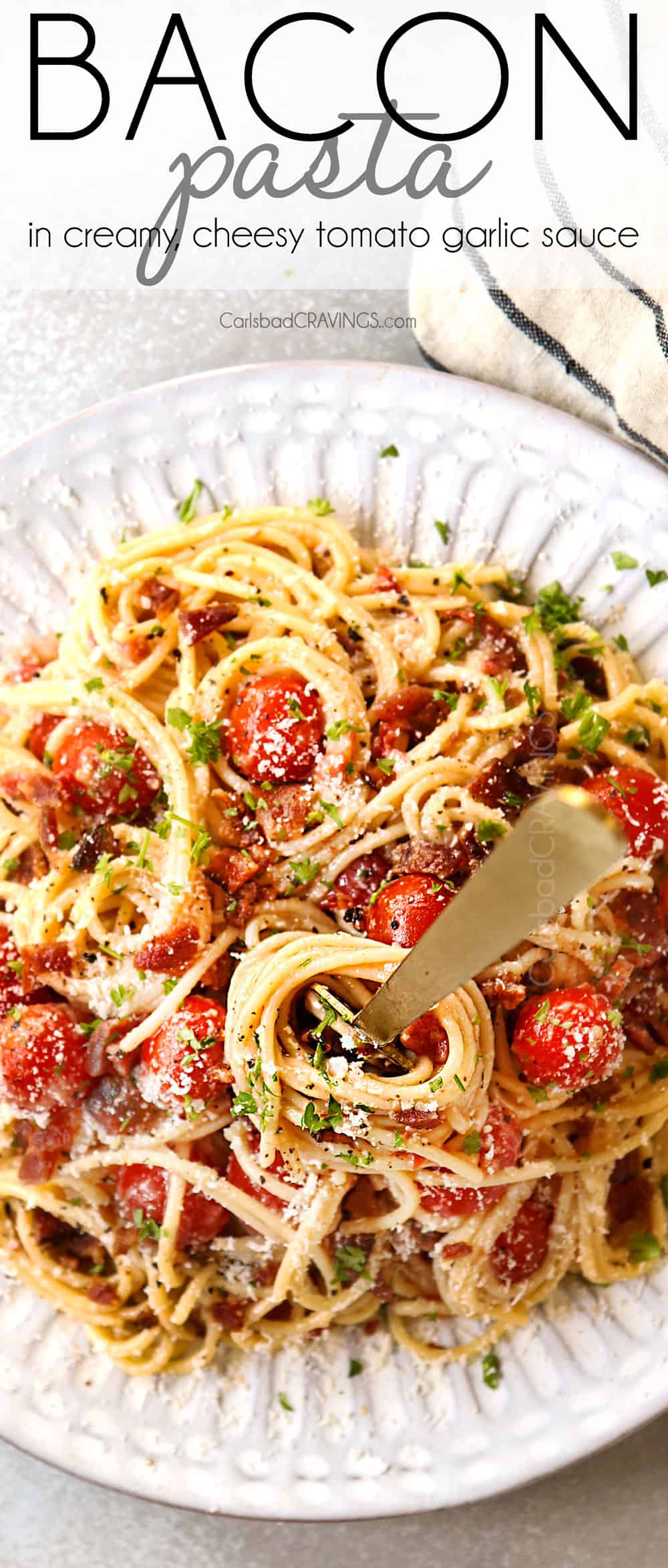 This Bacon Pasta is guaranteed to become a family favorite with its intoxicating aroma, smoky, salty, porky-sweet flavored, shatteringly crispy bacon and cozy, comforting, luxurious sauce. It’s made with loads of fresh garlic and crispy bacon enveloped in a creamy, cheesy sauce spiked with blistered cherry tomatoes, Italian seasonings, salty Parmesan and sweet, buttery Gouda (may sub cheddar). You can keep the Bacon Pasta recipe simple or pump it up with shrimp, chicken or any veggies of choice such as broccoli, bell peppers, or asparagus. Your family will love this easy indulgent pasta dinner with a side of Garlic Bread or Buttery Breadsticks and fresh Green Bean Salad.