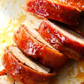 The bacon. Bacon brings the juicy, crispy, salty deliciousness! Wrapping the pork tenderloin in bacon not only prevents it from drying out, but the fat from the bacon bastes the pork as it roasts, infusing it with undeniable flavor. It’s then broiled for a caramelized, irresistibly crispy finish.