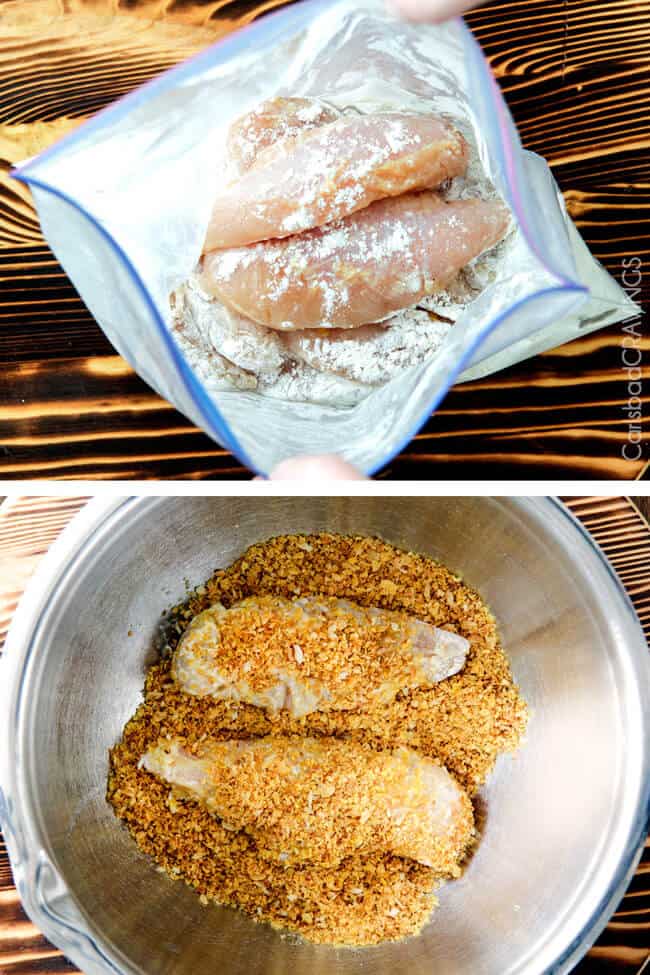- Line up your breading station: Add flour to a large freezer bag. Whisk milk and eggs together in a bowl or shallow dish. Mix panko, ground cornflakes, ½ teaspoon salt, ⅛ teaspoon pepper and ½ teaspoon garlic powder in a large bowl.
