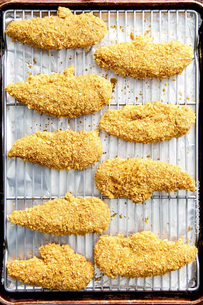- Remove chicken from marinade and pat dry with paper towels. Add chicken to flour and toss until evenly coated. Working with one chicken tender at a time, remove from flour, shake off any excess then coat in milk/egg mixture and drain off any excess. Roll chicken in panko/cornflakes, pressing to adhere. Shake off any excess and place on wire rack. Repeat until all chicken tenders are breaded.