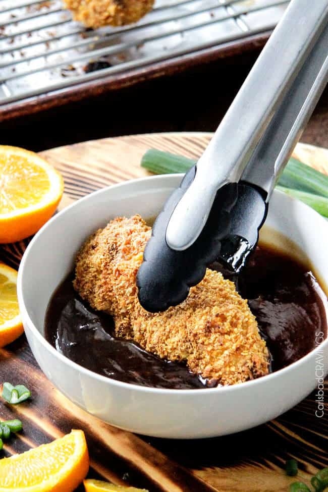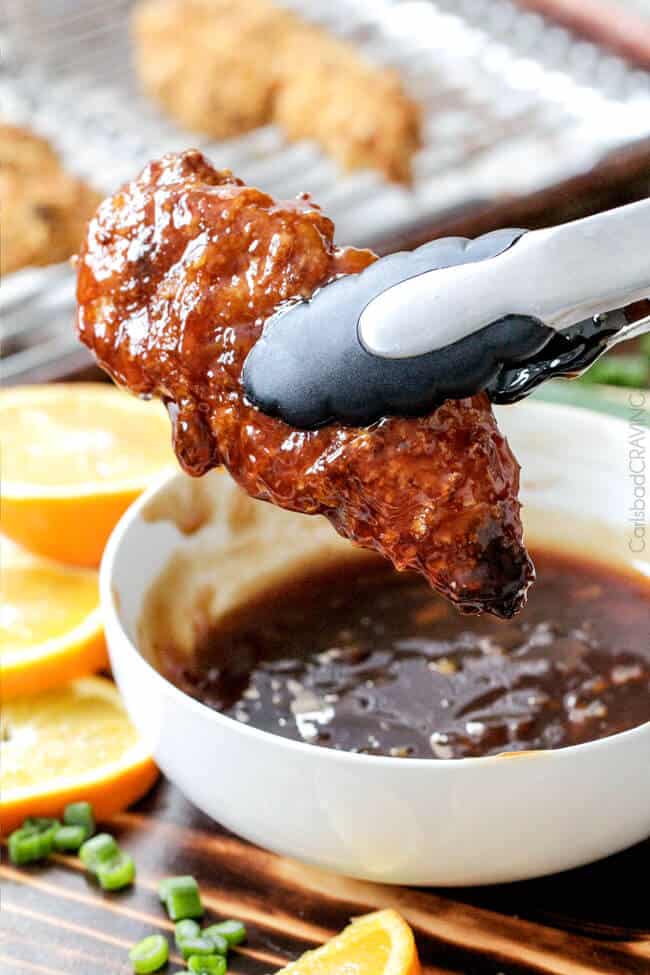 I’m already wanting more…More hypnotic Baked Orange Chicken Tenders. They are bursting with flavor by being marinated in a sweet and spicy (but not too spicy) orange sauce which doubles as the tantalizing sticky Orange Glaze later. This is one of my favorite methods of cooking – to reserve some of the marinade, whisk it with cornstarch and it instantly becomes your glaze – double the flavor WITHOUT double work!
