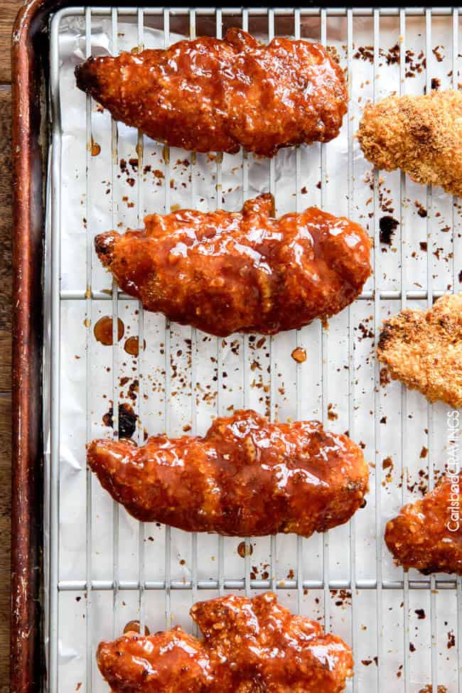 After you coat your chicken in sauce you are going to want to eat them right away – I mean of course you are going to want to eat them right away, but the sooner you devour them, the firmer the breading will be. That being said, they are still incredible with softer breading. As in Patrick ate all the leftovers and if you knew Patrick, he doesn’t do leftovers unless they taste just as AH-mazing the next day.