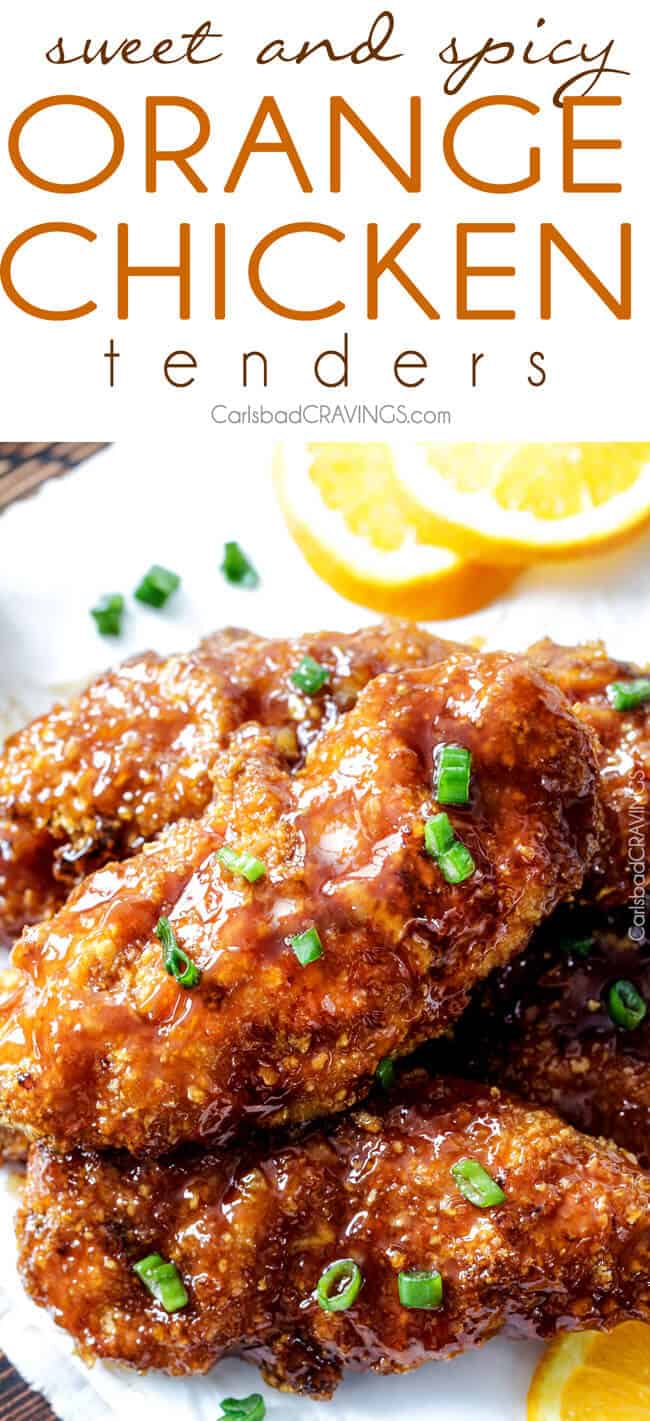Sweet and Spicy Baked Orange Chicken Tenders are marinated and smothered in the most tantalizing sweet heat orange sauce you can’t even imagine! You will crave this chicken over your favorite Chinese orange takeout!