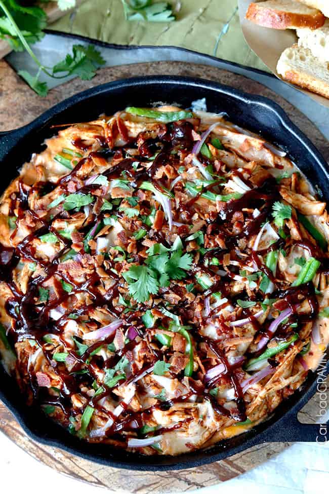 Absolutely! You can prepare the BBQ Chicken Dip up to the point of baking then cover with foil and refrigerate. When ready to serve, let it sit at room temperature for 20 minutes then bake per recipe instructions or until nice and hot in the center.