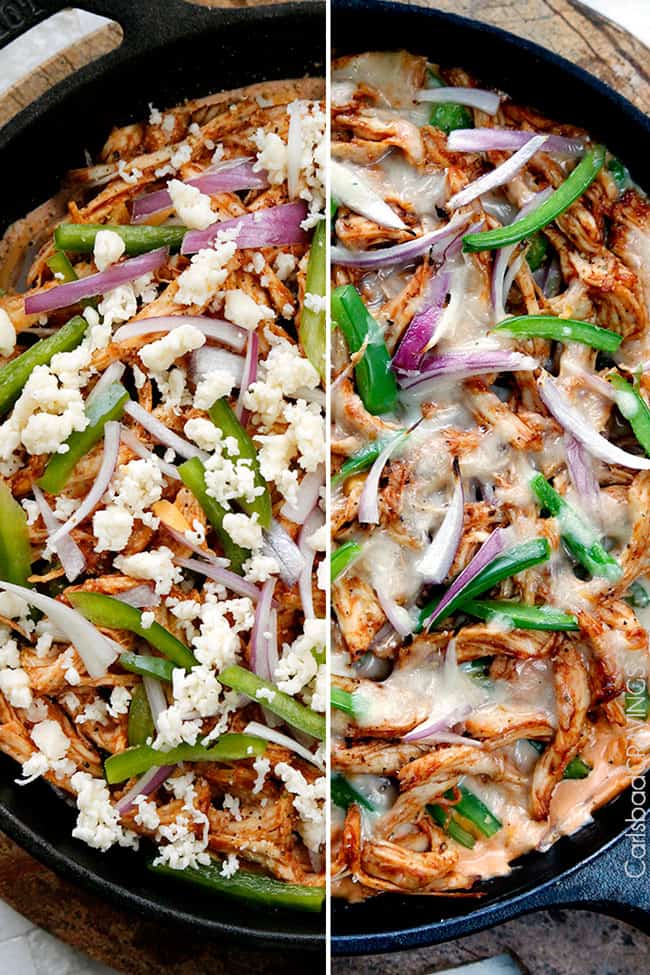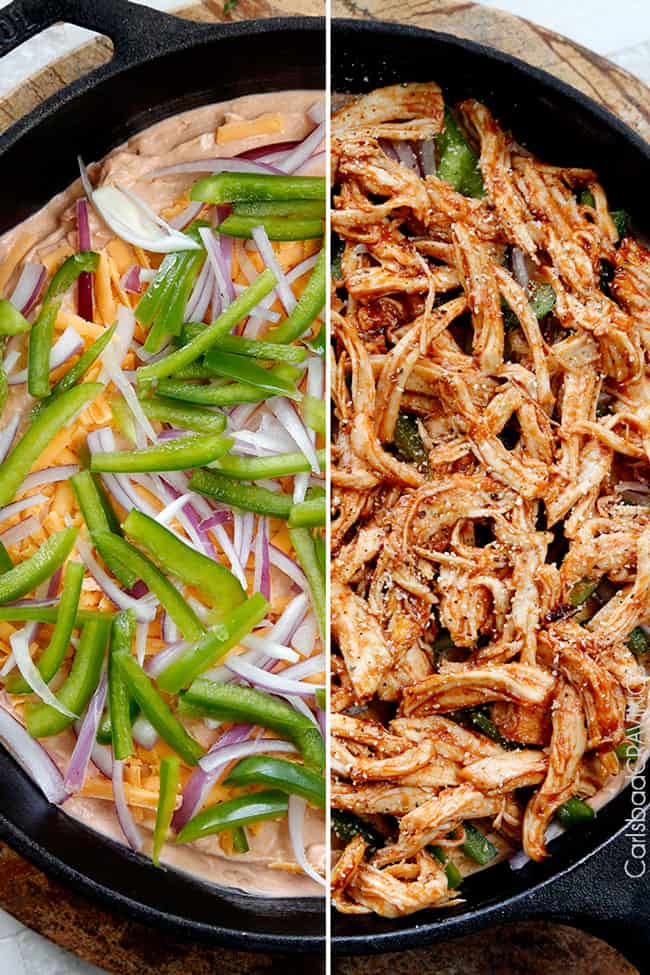 Next, layer the creamy, cheesy barbecue delight into a baking dish/skillet and top with more sharp cheddar, fresh thinly sliced green peppers, red onion, barbecue chicken and mozzarella cheese.