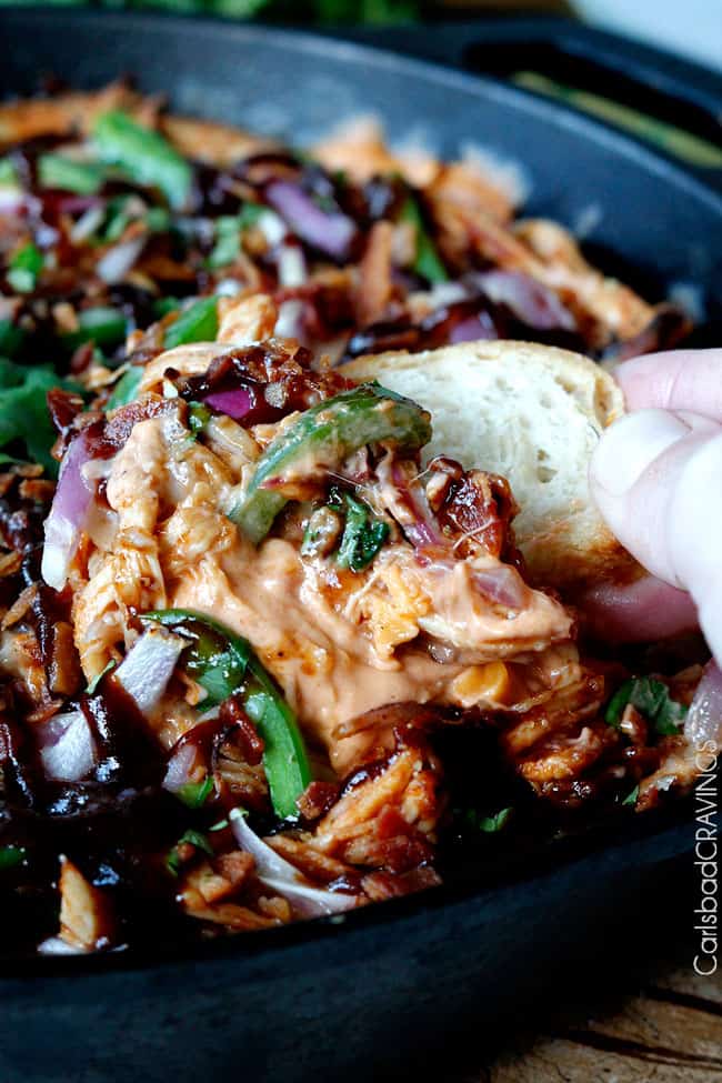 - My favorite dippers for BBQ Chicken Dip are slices of a French baguette. I toast the slices first by brushing them lightly with olive oil, spreading in an even layer and baking at 400 degrees for 10 minutes.