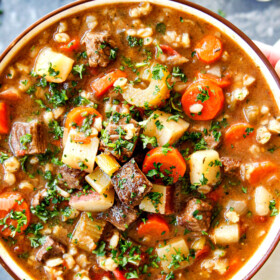 This Beef Barley Soup recipe is rich, hearty, satisfying comfort food with huge flavor and minimal effort! It’s loaded with buttery beef, onions, carrots, potatoes, celery and perfectly textured barley in a rich, flavorful beef broth. This Beef and Barley Soup is the perfect make-ahead dinner, reheats beautifully and freezes well too! It is an old comforting classic waiting to become a new family favorite!