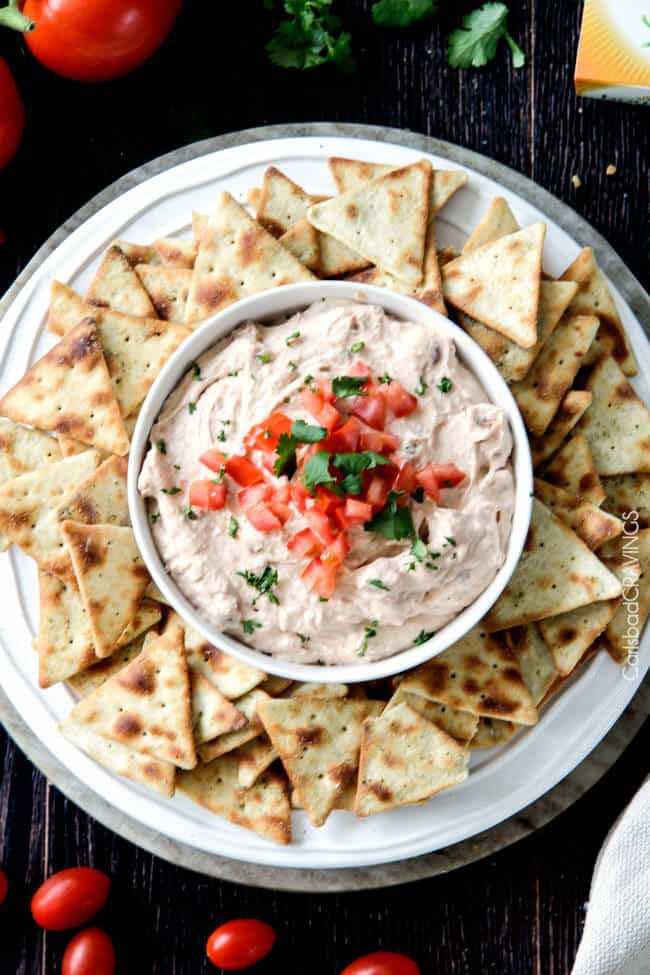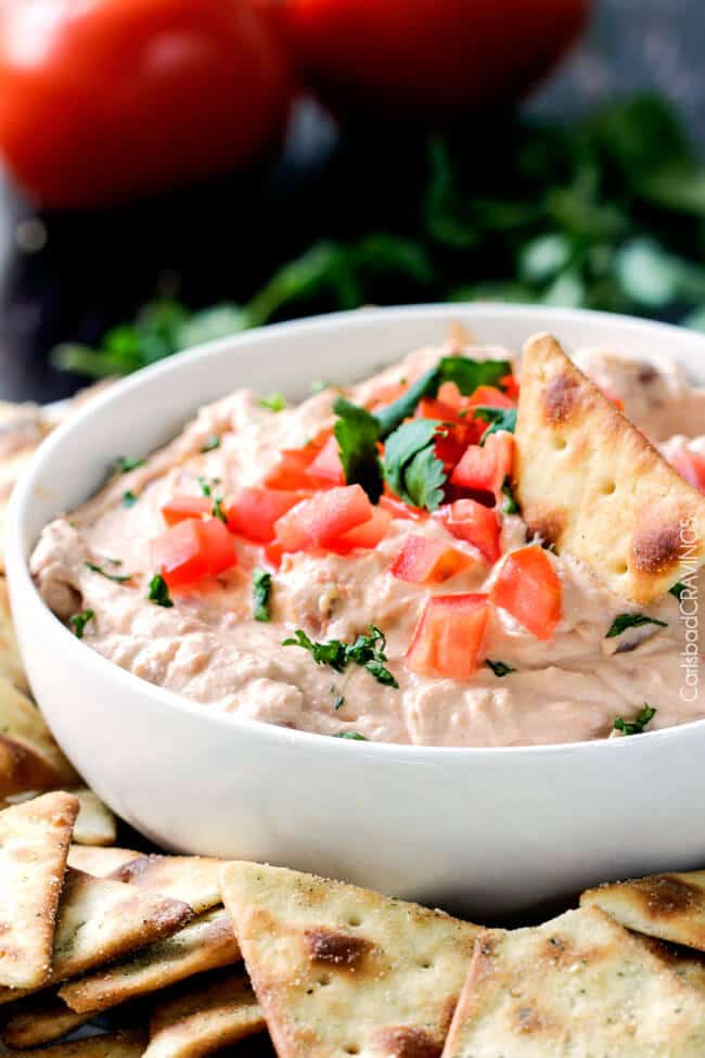 I like to think all of Carlsbad Cravings recipes are really flavorful from my Guacamole, Queso Fundido, Cheesy Chili Dip, Queso Verde Corn Dip, and Jalapeno Popper Dip. If a recipe needs an extra spice – I am going to add it, even if it means the ingredient list gets a little longer – because your foodie experience is worth it! So for me to post a 3 ingredient Bean Dip recipe and to go a step further and claim it as “the BEST” is a shock – even to myself. But I totally believe it is. And I think with one chip-full of this Refried Bean Dip you will agree.