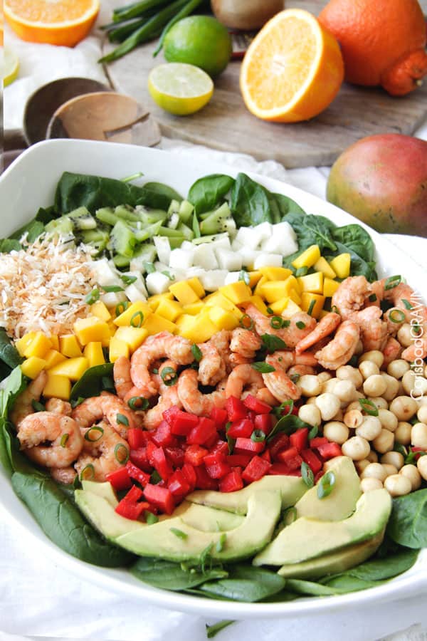 This salad is such a delicious plate of tropical flavors. (And I love the shrimp.) The salad makes such a wonderful, healthy dinner on hot nights.