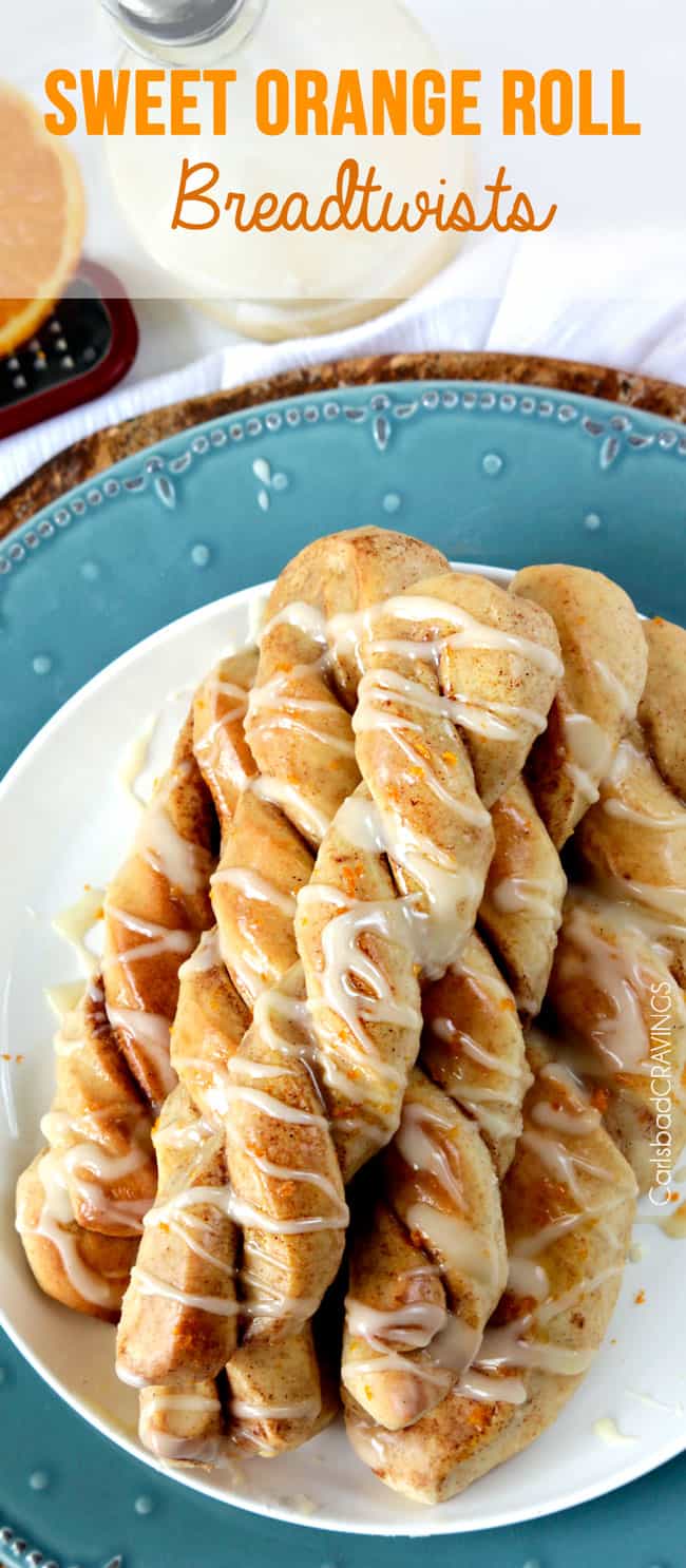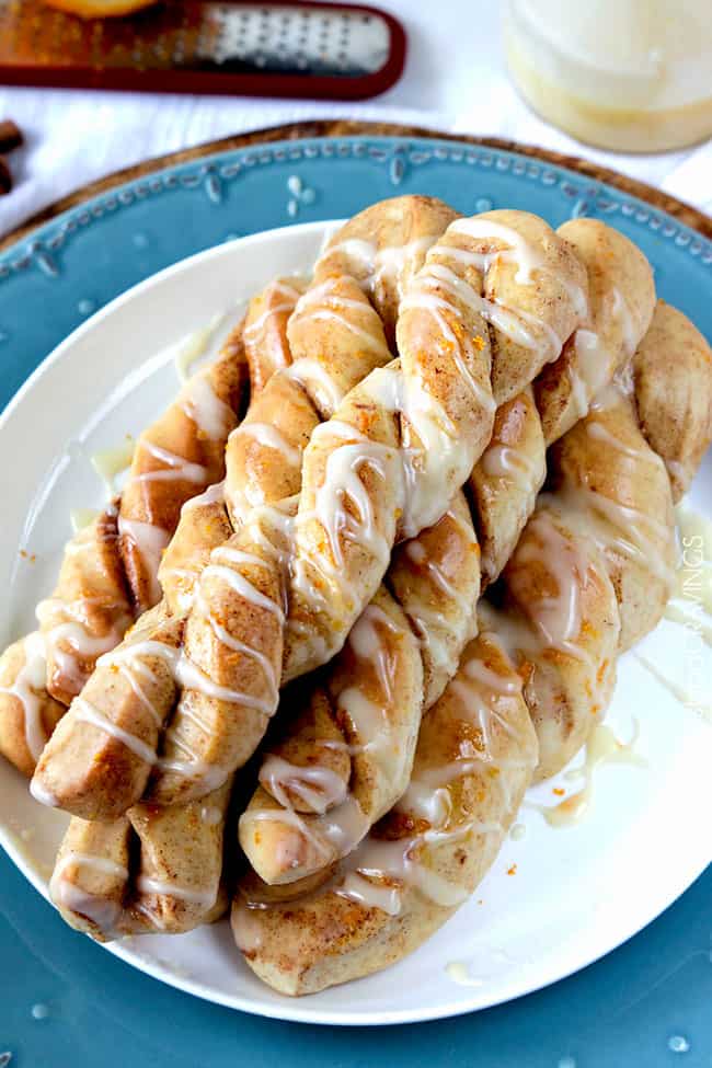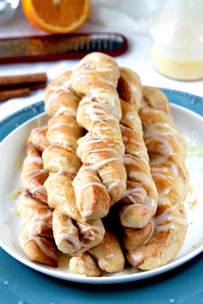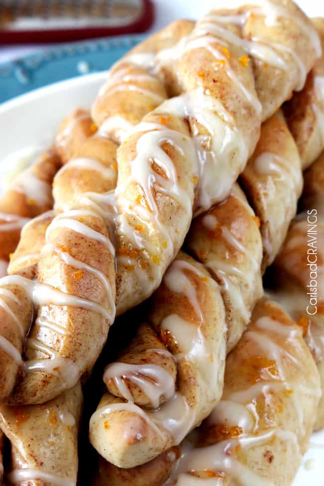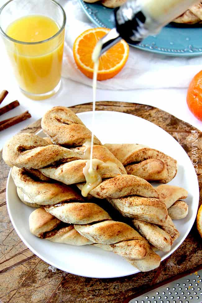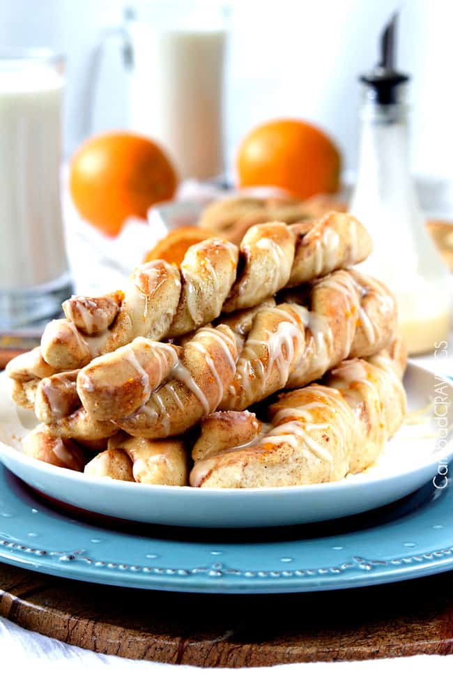 But its definitely because they have orange juice in the dough, and get drizzled with tantalizing orange glaze that you will be tempted to double just so you can dunk the entire twist in it because you just cant get enough. Do it.