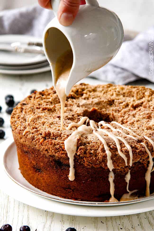 There are always variables in any recipe, so start with this glaze recipe for your Blueberry Coffee Cake and either add more powdered sugar for thicker or milk, one teaspoon at a time for thinner.