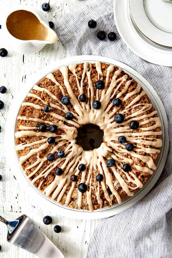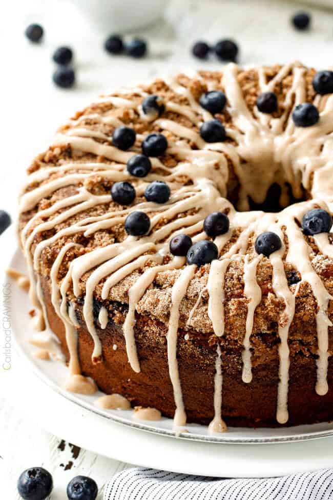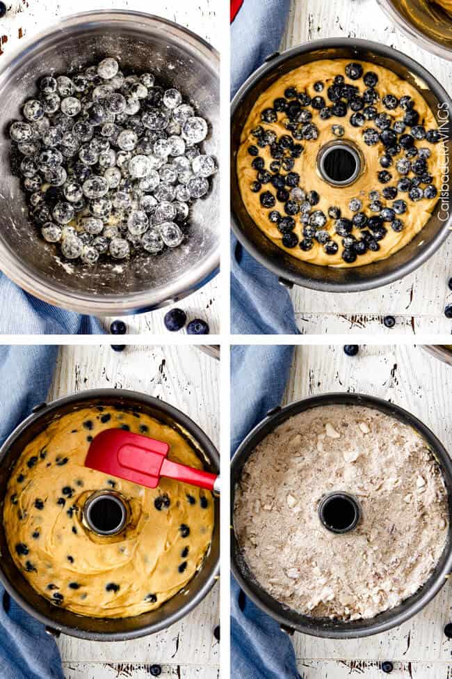 - Use correct pan: You need a 16 cup/10-inch nonstick tube pan for this Blueberry Coffee Cake recipe. A bundt cake pan will NOT work because it does not have enough volume and the coffee cake will overflow. The streusel also won’t be on top when inverted if you use a bundt pan.