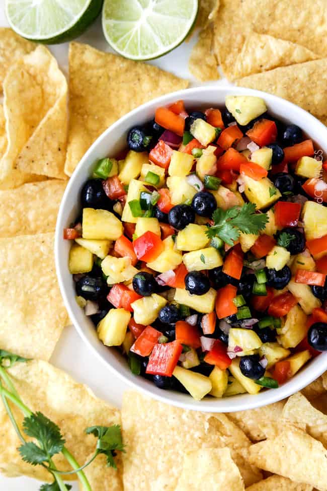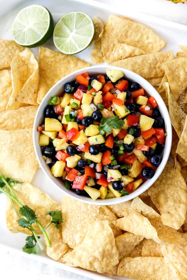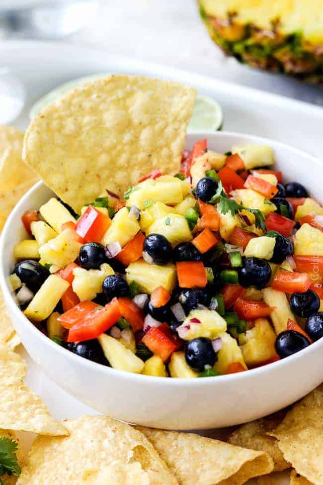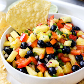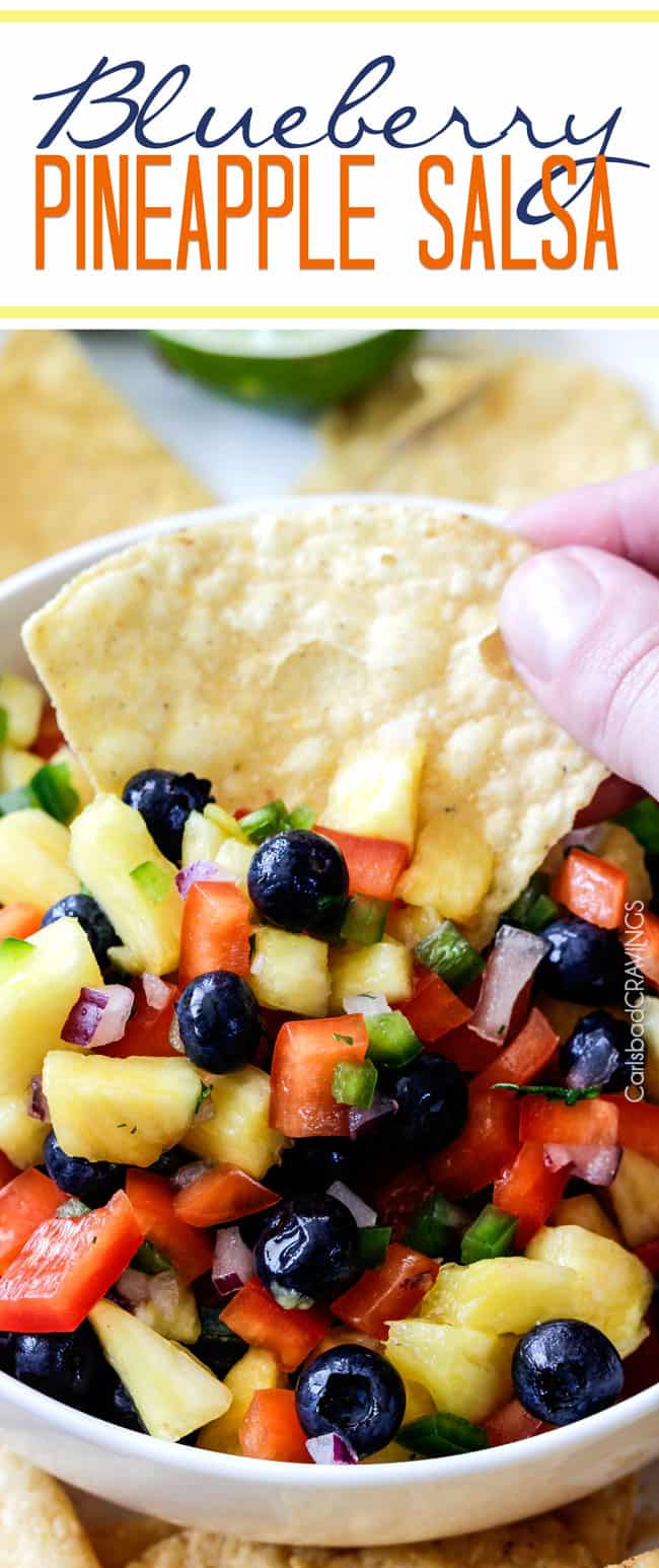 Refreshing sweet, bright Blueberry Pineapple Salsa is addictingly delicious with chips, on chicken, fish, tacos or just a spoon! Â This easy salsa makes everything better and is the easiest tastiest appetizer!
