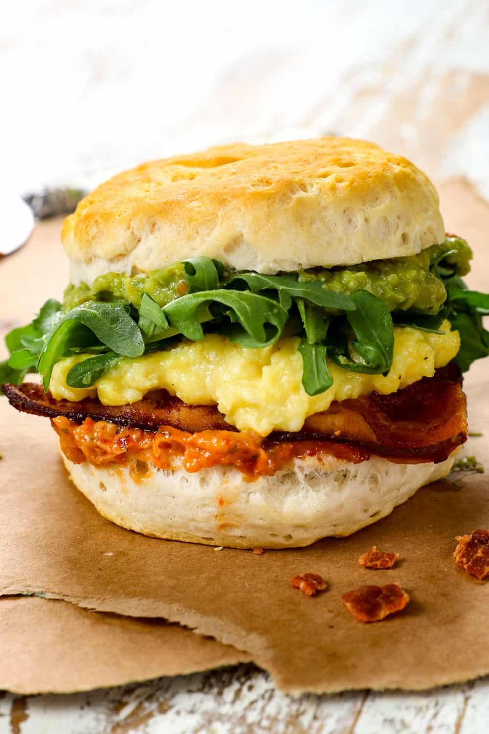 With one bite, these Breakfast Sandwiches will whisk your taste buds away to the Mediterranean. The eggs are scrambled with Parmesan and mozzarella to ultra soft, fluffy, cheesy perfection, the biscuits are slathered with tangy, spicy, herbaceous sun-dried tomato aioli (it makes the sandwiches!), the bacon is salty, savory and crispy and to top it off, you have the option to add creamy, tangy guacamole and fresh arugula. Each bite is a creamy, crunchy, full flavored dream.
