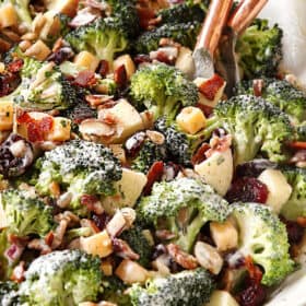 This Broccoli Salad is the salad of your crunchy, creamy, sweet, savory, refreshing, tangy dreams. It’s easy, make ahead friendly, stays super fresh, doesn’t wilt, is utterly addicting and always disappears in a flash. This Broccoli Salad recipe is packed with vibrant, fresh broccoli, salty, crispy bacon, creamy Gouda cheese, crunchy Fuji apples, sweet craisins, tangy red onions, crunchy almonds, and roasted sunflower seeds all doused in the BEST light, creamy, herb laced dressing. So, if you’re looking for the best Broccoli Salad recipe to have in your back pocket, this is the ONE!