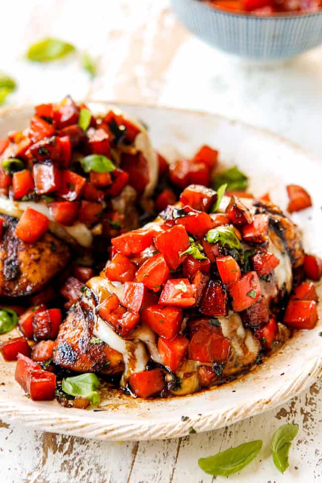 - Combine bruschetta ahead of time. Mix the bruschetta ingredients together at least 30 minutes before you plan on serving. This lines up perfectly with bringing your chicken to room temperature – so when you remove the chicken from the fridge – make your bruschetta. Letting the bruschetta ingredients sit and marinate together allows the flavors to build and blend and has a huge impact on the final outcome.