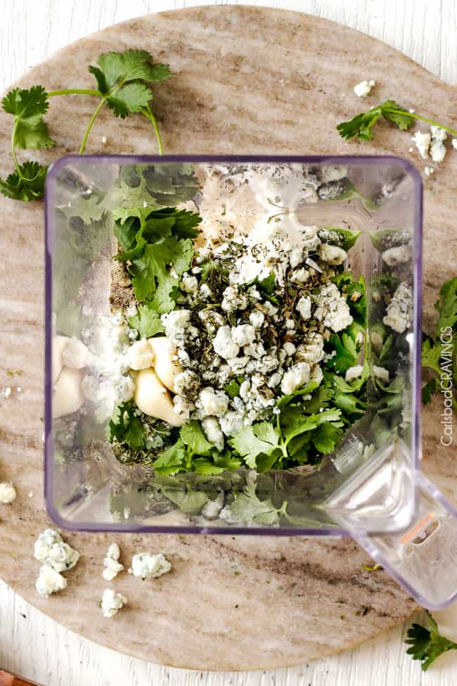 - Blue Cheese Cilantro Ranch: While your chicken is marinating, add all of the dressing ingredients to your blender. Blend until smooth, adding milk as needed to reach desired consistency.