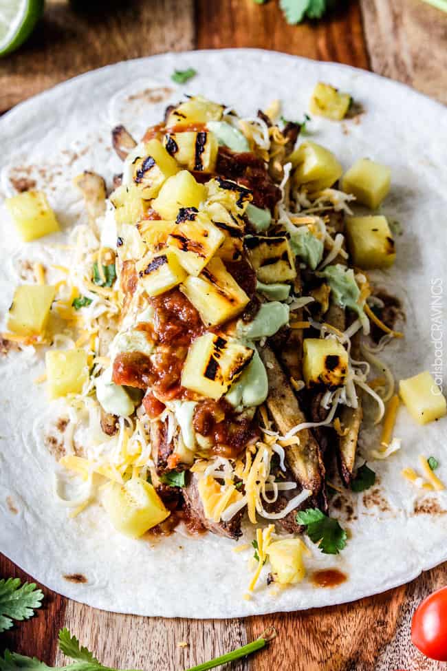 - To assemble, layer carne asada in the center of each burrito, then add fries, cheese, avocado crema, salsa, and pineapple. Fold in the top and bottom and roll tightly in burrito style.