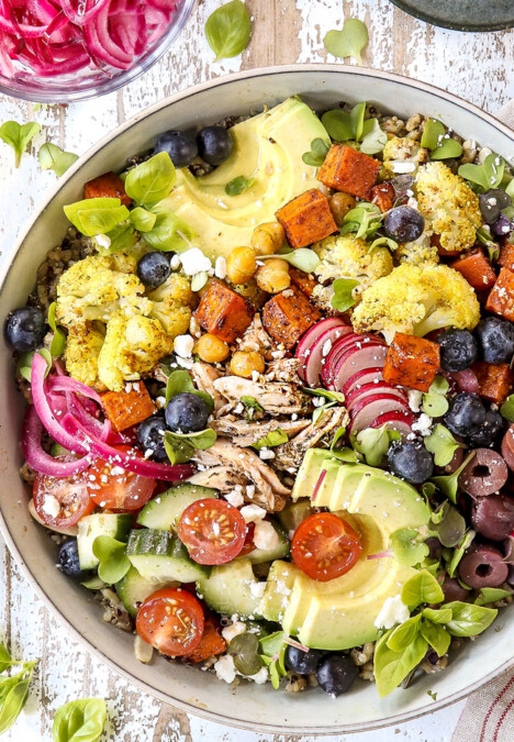 30 Minute Cajun Chicken Bowls bursting with avocados, black beans, sweet potatoes and pineapple!  These are spicy, fresh, healthy and ADDICTING!