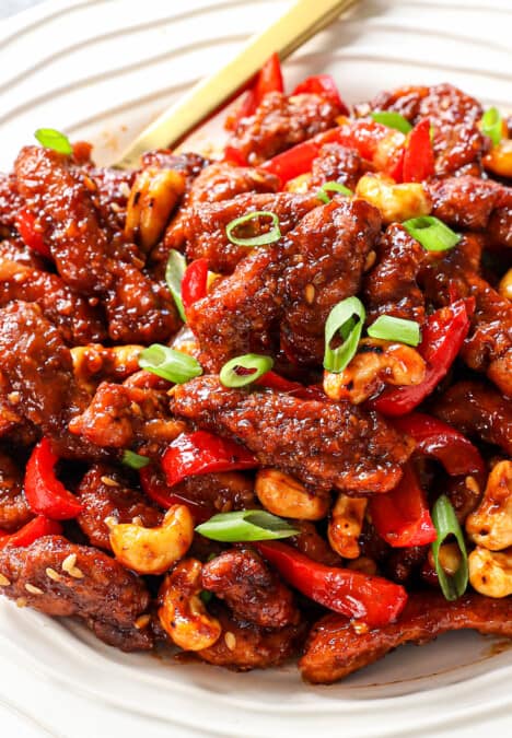 showing how to serve cashew chicken recipe on a white rice garnished with green onions