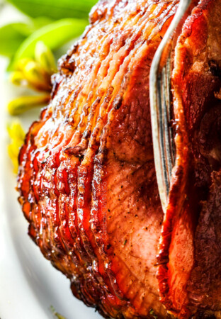 up close of ham and cheese sliders made with Hawaiian rolls baked in a 9x13 casserole dish