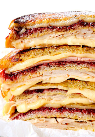 showing the best croque monsieur recipe by stacking the sandwiches cut in half showing the cheesy, creamy inside