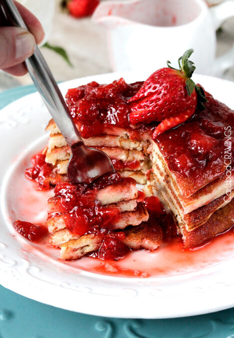 Angel Food Cake French Toast with Cream Cheese and Strawberry Syrup