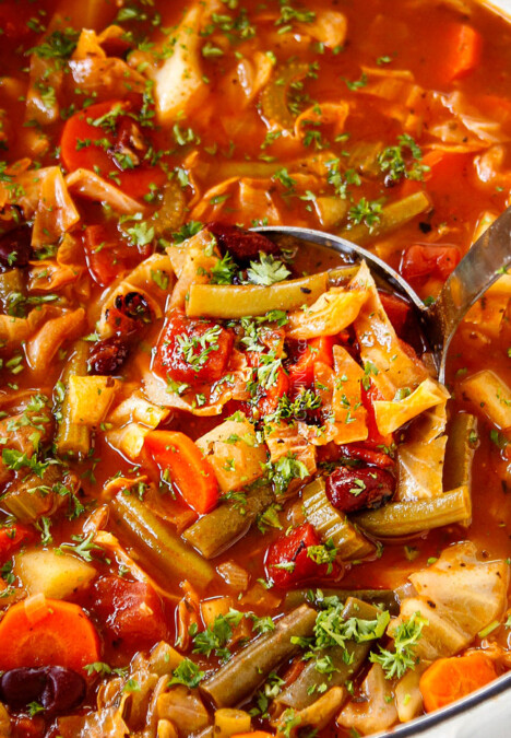 top view of homemade vegetable soup being served in a bowl