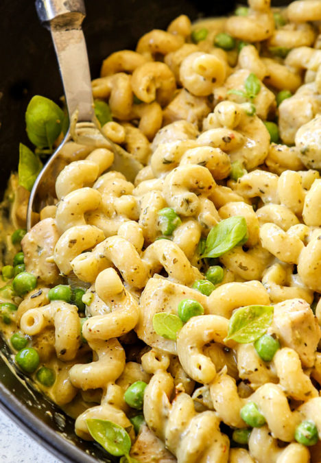 top view of creamy garlic Parmesan chicken in a skillet showing how creamy the Parmesan sauce is