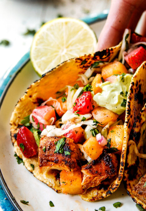 up close showing how to serve steak fajitas by wrapping up with steak, bell peppers, guacamole and pico de gallo