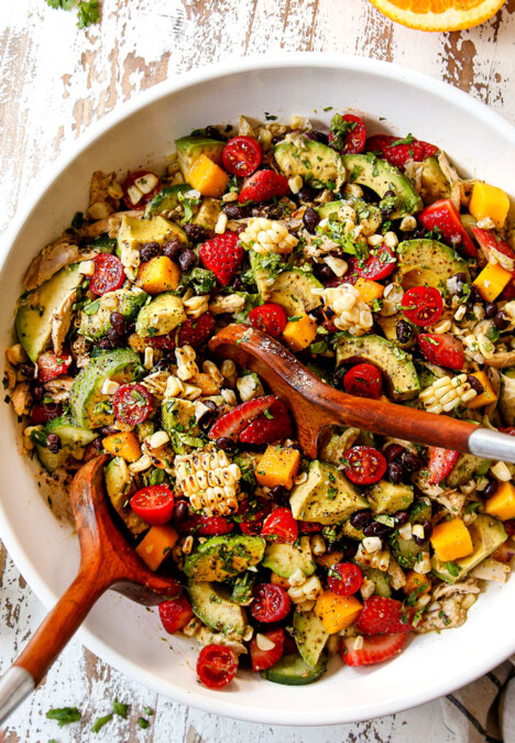 top view of chicken fajita salad (chicken salad recipe) in a wood bowl with chicken, tomatoes, avocados, bell peppers