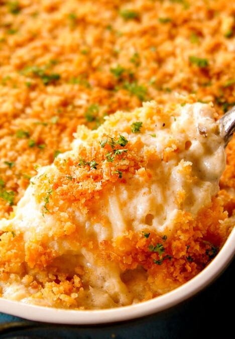 up close view of Twice Baked Potato Casserole showing how cheesy it is