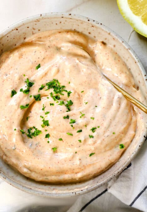 showing how to serve homemade tartar sauce by dipping a fish stick in the sauce
