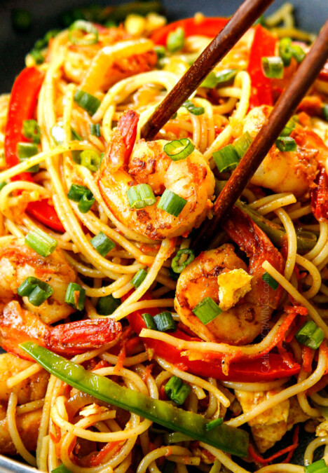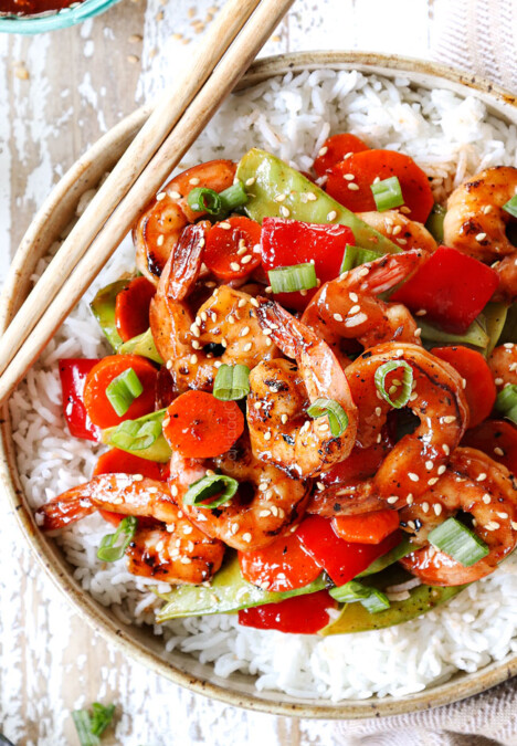 showing how to make shrimp fried rice by garnishing with green onions and seasoning to taste