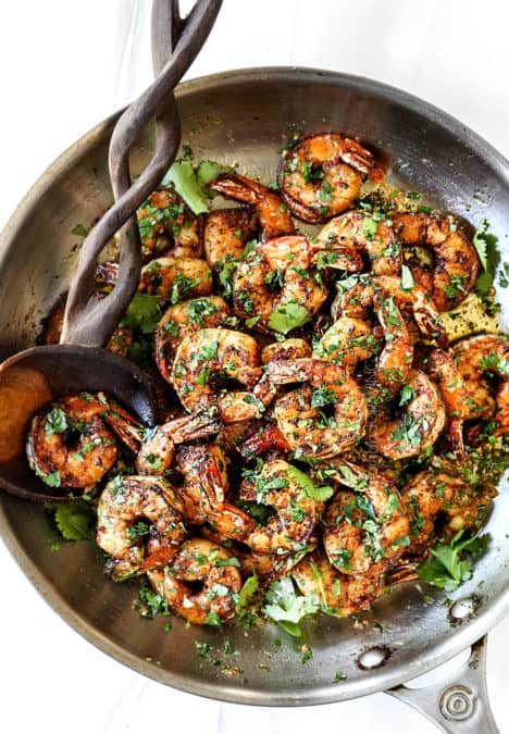 showing how to make Cajun shrimp recipe by tossing sautéed shrimp with butter and parsley