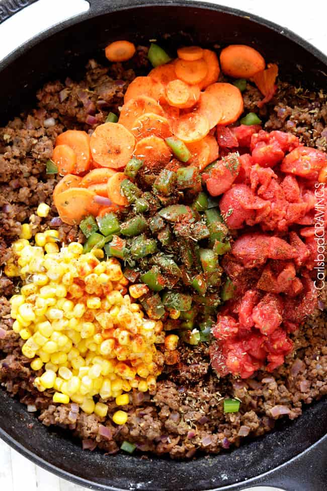 - Meat and Vegetables: Brown beef and onions in a 12” oven proof skillet* over medium high heat until beef is cooked through. Drain off excess grease.